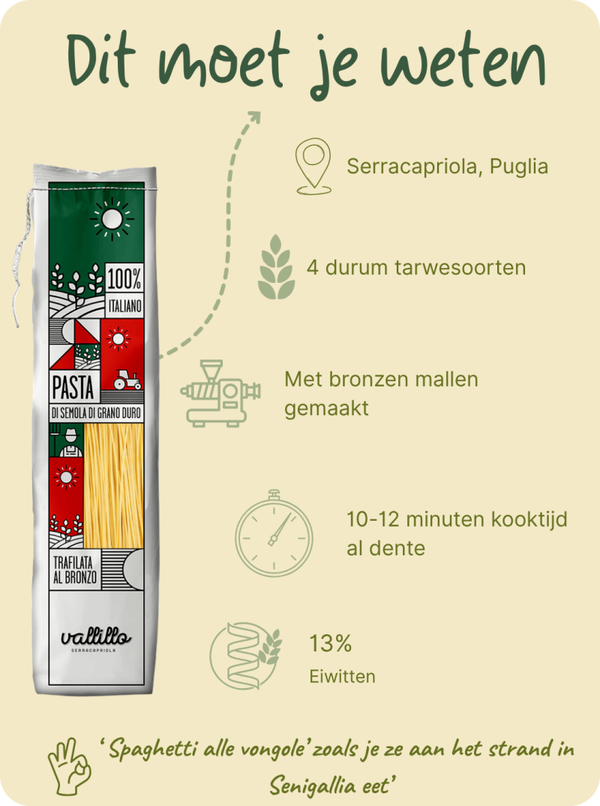 Spaghetti uit het Noorden van Puglia met een lekkere al dente bite. Langzaam en hangend gedroogd. Bevat geen eieren.