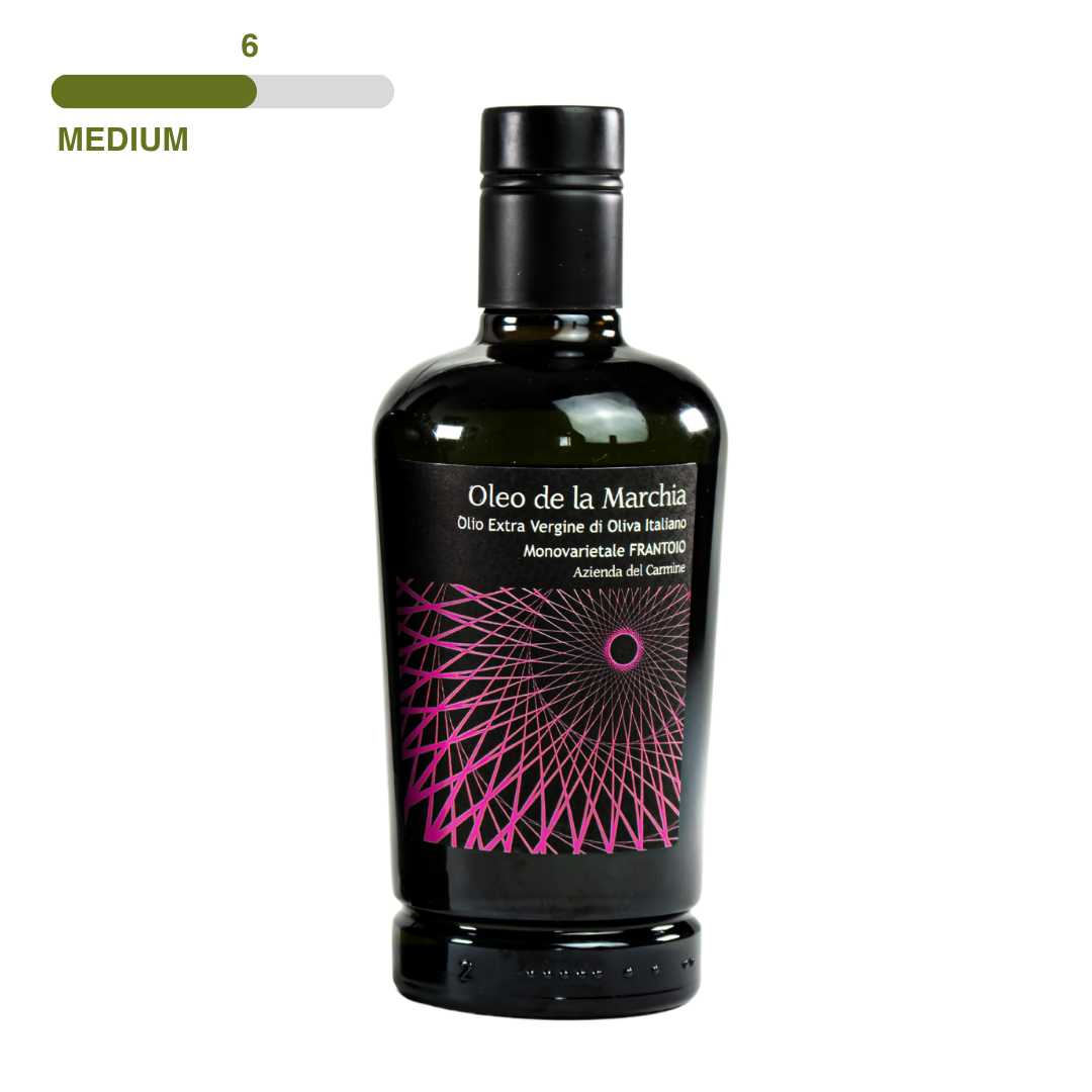 De Frantoio is een van de meest bekende olijfsoorten uit midden Italië. Hij heeft een mooi vers en fris aroma, met in de geur gras, groene amandel en groen blad. De olie is prachtig in balans en in de afdronk zit duidelijk scherpte en wat bitterheid, tekenend voor een hoge kwaliteit olie.