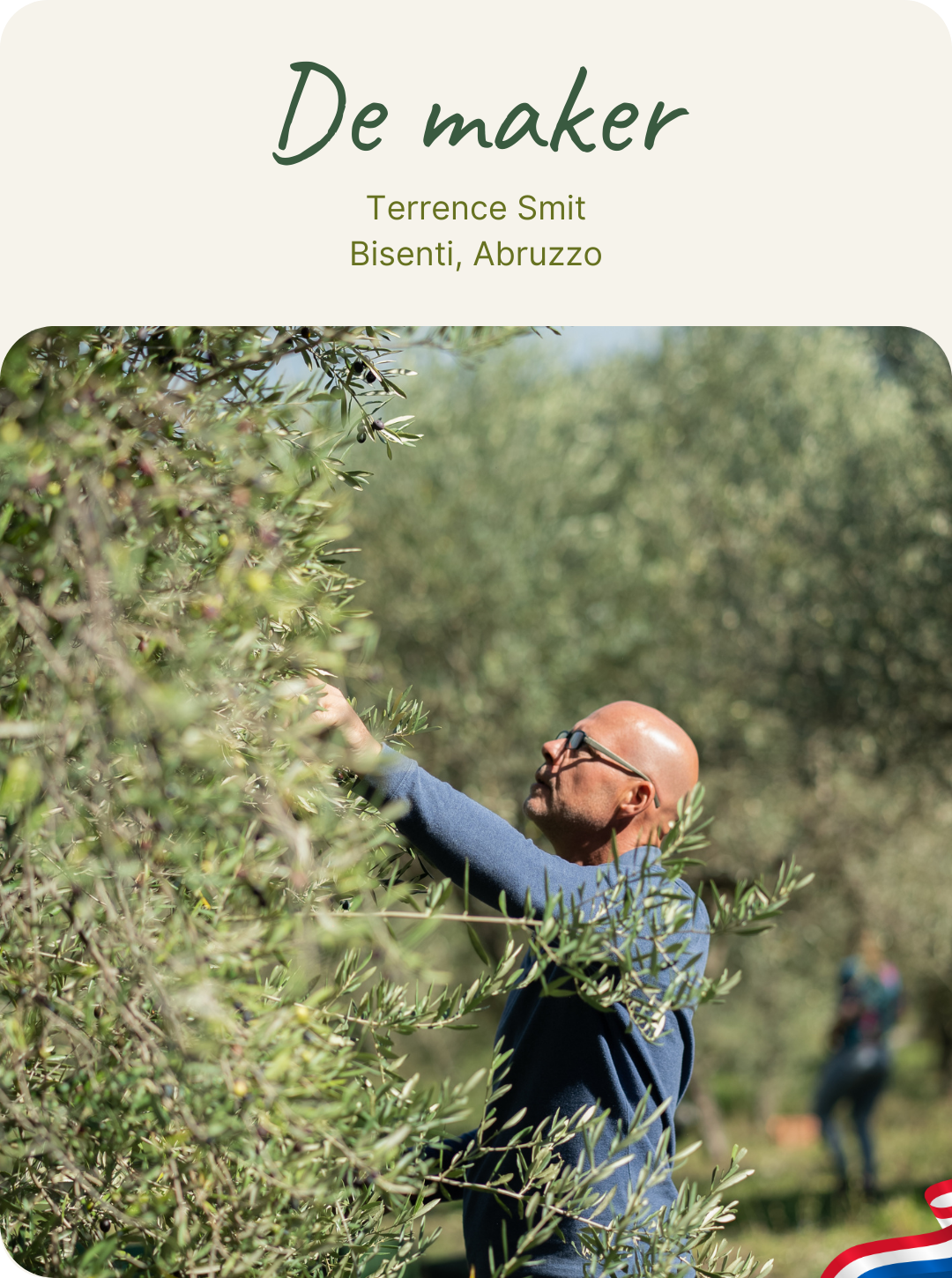 'Op onze familiegrond in Bisenti hebben we in totaal ongeveer 1 hectare aan kleine olijfgaarden, met samen 225 olijfbomen van de rassen Dritta en Leccino. De oogst is gedaan in oktober 2025, volledig met de hand, door familie uit Nederland, vrienden uit Bisenti en mijn ouders. In de oogstperiode zijn de olijven iedere dag rechtstreeks naar Frantoio Tini, de lokale perserij waar mijn ouders mee werken, gebracht.'