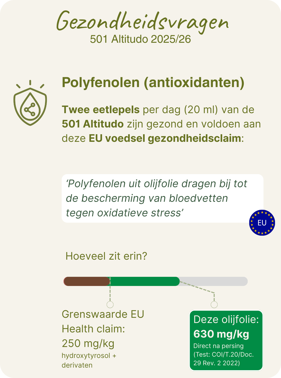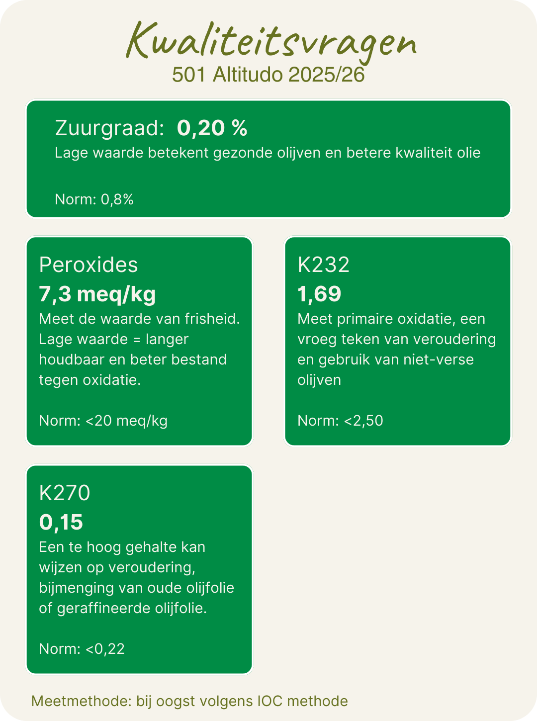 - Kwaliteit: Elke olijfolie wordt beoordeeld op 14 kwaliteitsaspecten m.b.t. geur, smaak, complexiteit en afdronk. De olijfolies die ik selecteer zijn veelal afkomstig van kleinschalige bedrijven met focus op topkwaliteit.