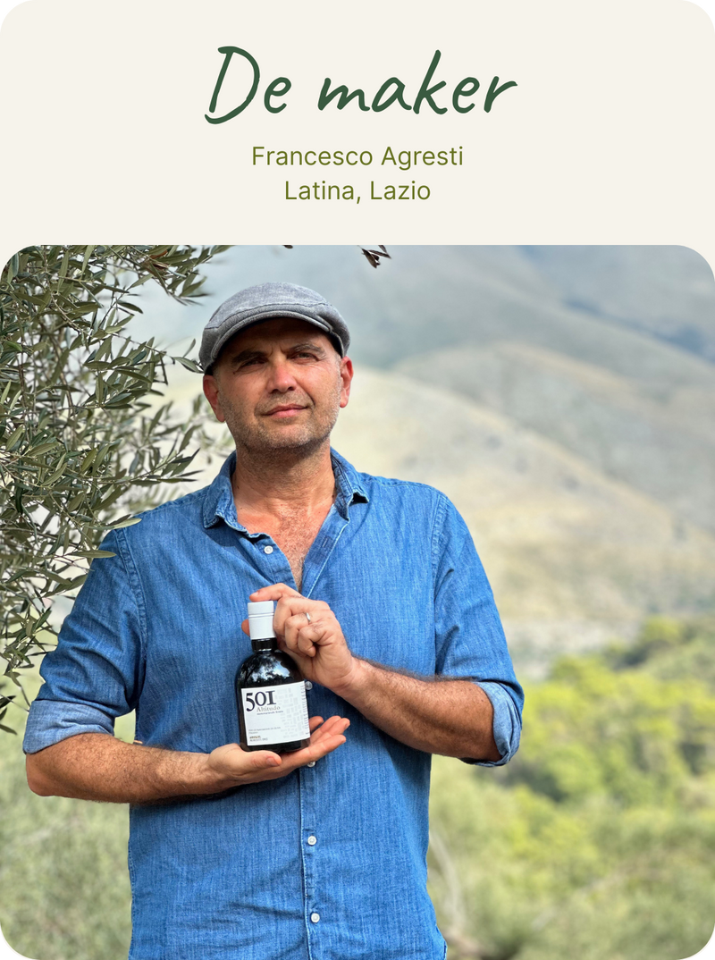 Francesco Agresti besloot een aantal jaren geleden een verwaarloosde familieboomgaard aan te pakken en stap voor stap om te vormen naar een biodynamisch bedrijf. De hoge ligging van de olijfgaard (400-550 m) zorgt voor een hoger aandeel aan antioxidanten in de olijfolie. Antioxidanten dragen bij aan een gezond lichaam doordat ze celveroudering kunnen afremmen, en bijdragen aan de voorkoming van o.a. kanker.