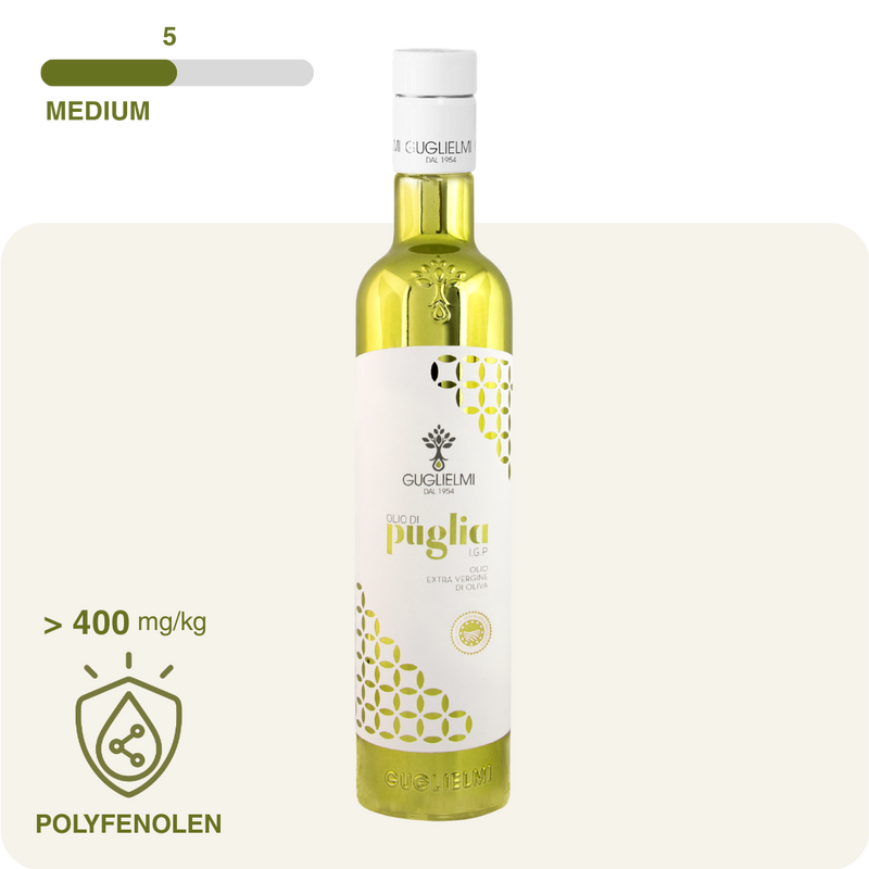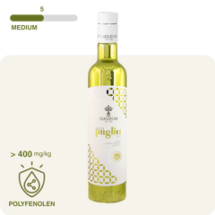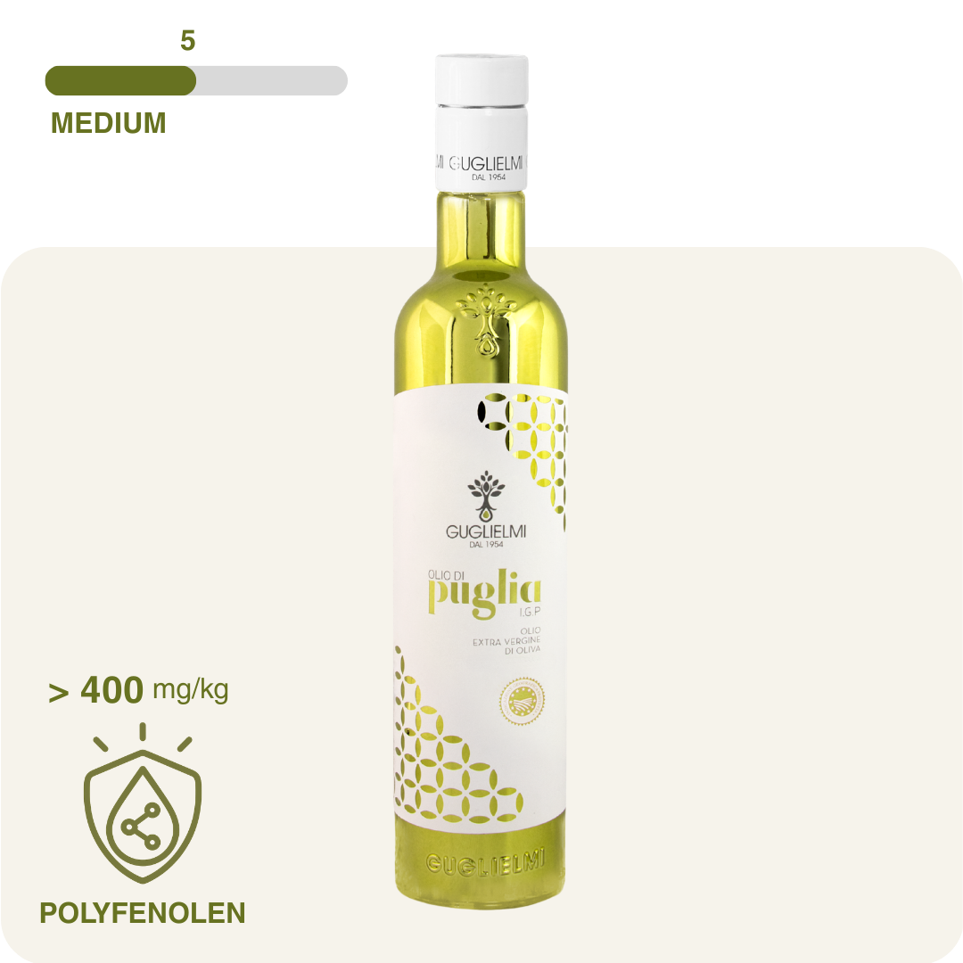 De extra vergine IGP Puglia olie wordt direct na de oogst koudgeperst.