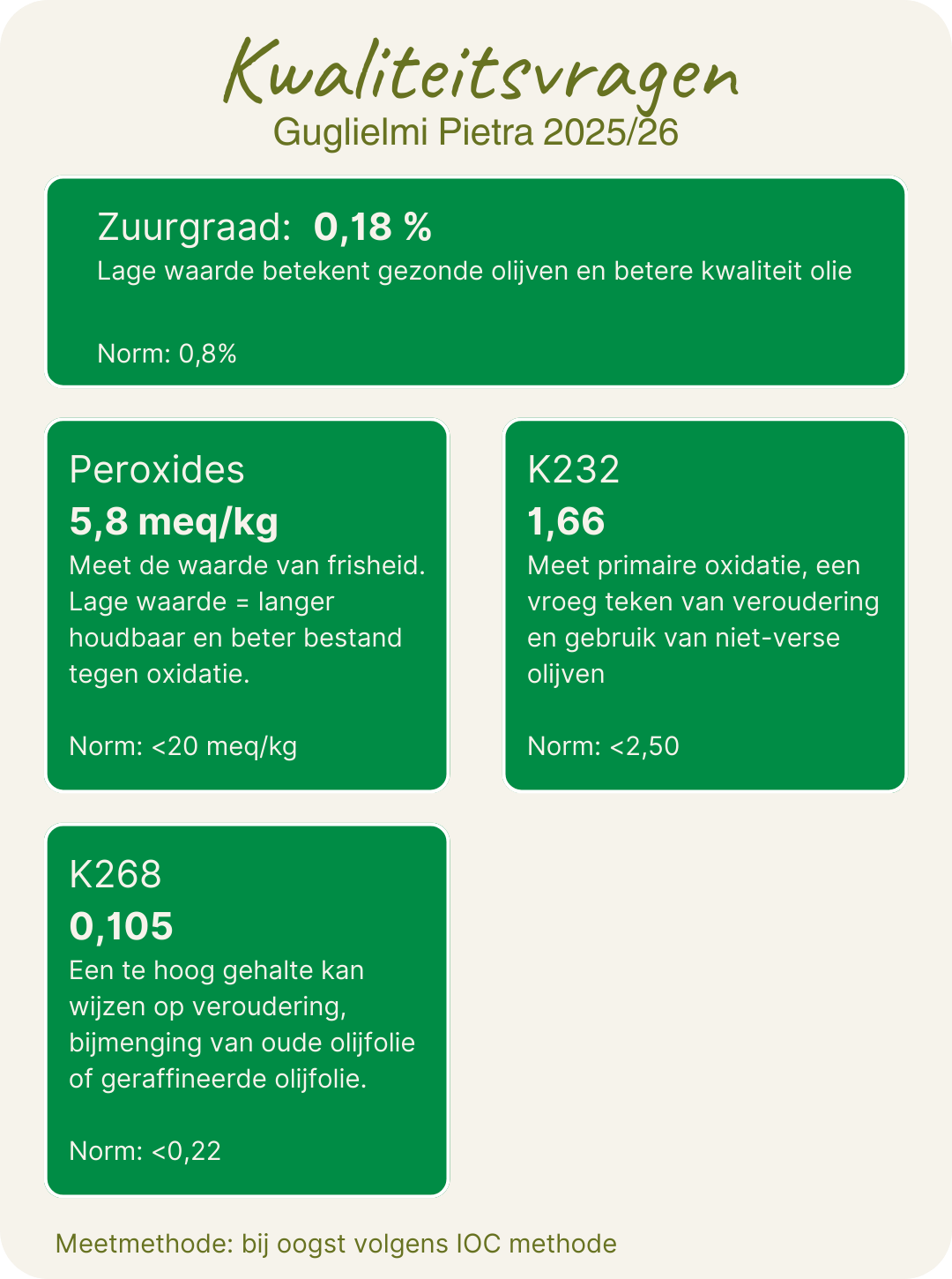 - Kwaliteit: Elke olijfolie wordt beoordeeld op 14 kwaliteitsaspecten m.b.t. geur, smaak, complexiteit en afdronk. De olijfolies die ik selecteer zijn veelal afkomstig van kleinschalige bedrijven met focus op topkwaliteit.