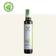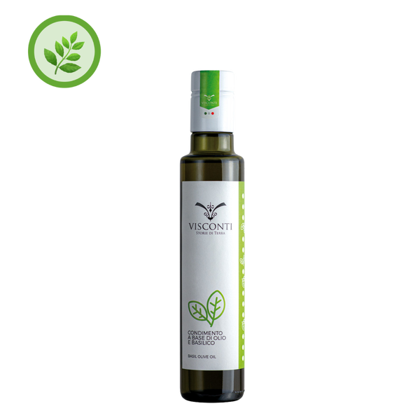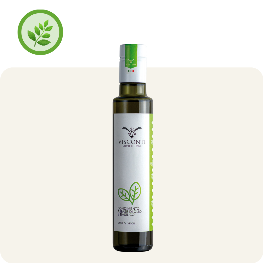 Olijfolie met de heerlijke aromatische geur van verse basilicum. Verkregen door het meepersen van verse basilicum met de olijven.